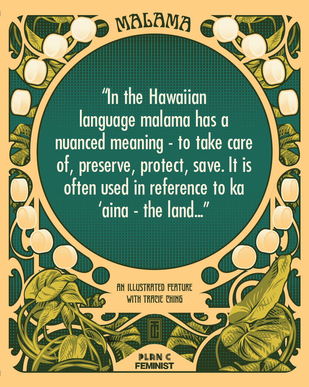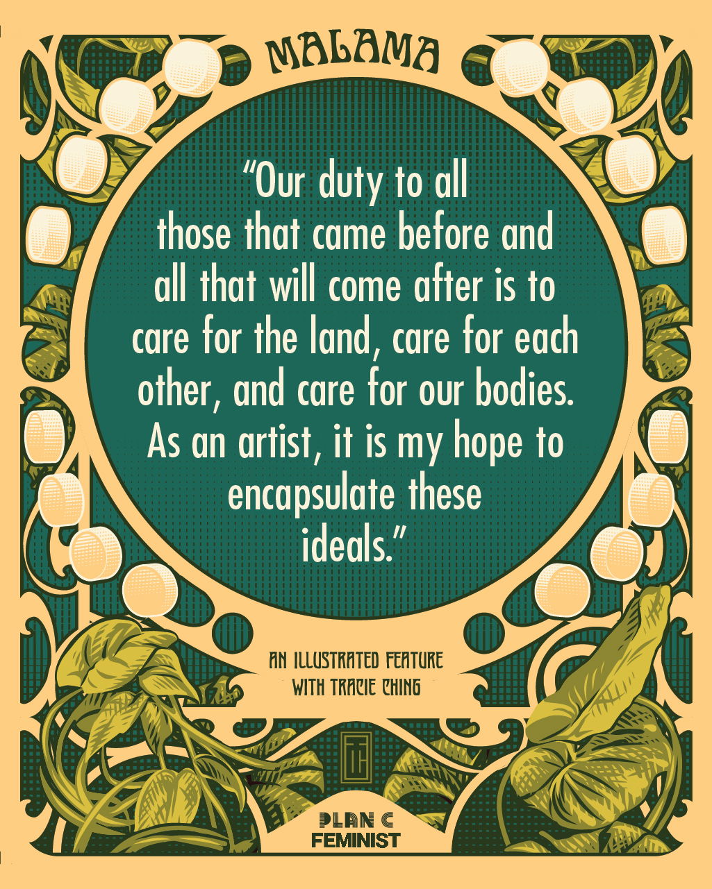 I was born on the island of Oʻahu but moved away when I was young. To heal some of my diasporic wounds, I earned a degree in Hawaiian Studies to better understand my people and my culture. One thing that was clear in my studies was the importance of mālama. In the Hawaiian language mālama has a nuanced meaning - to take care of, preserve, protect, save. It is often used in reference to ka ʻāina, or the land. In Hawaiian culture, everything and everyone throughout time are connected - tied to the earth. Our duty to all those that came before and all that will come after is to care for the land, care for each other, and care for our bodies. This was the inspiration for this feature’s illustration. For as an artist, it is my hope to perpetuate these ideals by serving as both conduit and representation.